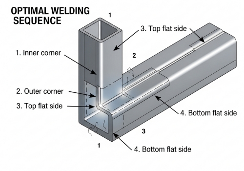 Heat causes metal to expand and pull out of shape. If you weld in the wrong order, your perfect 90-degree corner will twist into something unusable. To prevent distortion, tack weld all four corners first while checking with a framing square. Weld the inner fillet corner first, followed by the outer corner, and finish with the flat faces. This specific sequence balances the heat input and keeps the rectangular tubing straight and true to dimensions.
